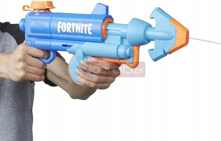 Inspirowany grą wideo Fortnite: Blaster wodny Fortnite HG ma wyposażenie używane w Fortnite jako wzór i taki sam wygląd jak w popularnej grze wideo Pompa pompki do pompki Super Soaker Blastera przesuwa się do przodu i do tyłu, cele mogą być rozpylane na mokro. Przednia część blastera porusza się do przodu i do tyłu podczas pompowania Łatwe napełnianie i ogień: otwórz pokrywę i napełnij zbiornik wodą, następnie zamknij pokrywę i przesuń uchwyt pompy do przodu i do tyłu, aby wystrzelić strumień wody do wszystkich celów w zasięgu ręki