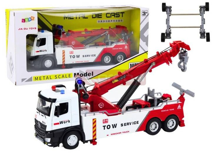 Ciężarówka Z Dźwigiem Dwa Haki Metalowa Biało-Czerwona Światła Dźwięki Ciężarówka z dźwigiem to wyjątkowo realistyczny model, który z pewnością zachwyci każde dziecko. Pomalowana w efektowną kombinację biało-czerwonych kolorów, przyciąga wzrok i wyróżnia się spośród innych zabawek. Konstrukcja ciężarówki skonstruowana jest w najmniejszych detalach, co nadaje jej autentyczny wygląd i pozwala dzieciom poczuć się jak prawdziwi operatorzy ciężkiego sprzętu. Dźwig wyposażony jest w haki przymocowane do linki, którymi można manipulować za pomocą pokręteł. Taki mechanizm umożliwia precyzyjne podnoszenie i opuszczanie przedmiotów, co rozwija umiejętności manualne i koordynację ruchową dziecka. Dodatkowym atutem jest możliwość obrotu dźwigu o 360 stopni, co zapewnia pełną kontrolę nad operacjami i daje nieograniczone możliwości zabawy. Efekty świetlne i dźwiękowe, które towarzyszą działaniu ciężarówki, dodają realizmu i potęgują wrażenia podczas zabawy. Światła migają, a dźwięki imitują prawdziwe odgłosy pracującego dźwigu, co sprawia, że dziecko jeszcze bardziej angażuje się w zabawę. Kabina ciężarówki wykonana jest z metalu, co nie tylko podnosi jej trwałość, ale także nadaje autentycznego wyglądu. Solidność i dbałość o szczegóły widać również w gumowych kołach, które zapewniają doskonałą przyczepność na różnych powierzchniach. Dzięki napędowi, ciężarówka porusza się do przodu po delikatnym pchnięciu, co dodaje dynamiki zabawie. Zestaw uzupełnia przyczepa, która nie tylko służy do holowania innych pojazdów, ale również dostarcza dodatkowych możliwości w tworzeniu różnorodnych scenariuszy zabawy. Dzięki niej dziecko może transportować różne ładunki, symulując prawdziwe operacje logistyczne. Całość tworzy niesamowicie wszechstronny i angażujący zestaw, który zapewnia godziny kreatywnej zabawy. Ciężarówka zasilana jest na baterie 3x AG13, które są elementem zestawu. Wymiary ciężarówki: 31cm x 12,5cm x 9,5cm Wymiary opakowania: 39,5cm x 19,5cm x 11cm Posiada certyfikat CE, ponadto jest zgodny z normą EN71. Przeznaczony dla dzieci powyżej 3 roku życia.
