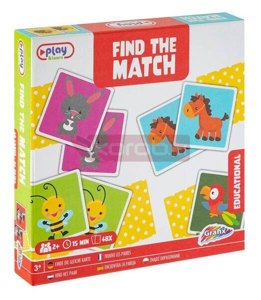 Znajdź pary, to zabawa MEMORY w postaci 60 kart z prostymi ilustracjami do połączenia w pary. Wygrywa ta osoba, która ma ich najwięcej. Proste ilustracje i nieskomplikowane wzory na kartach, jak np. chomik, banan, baloniki urodzinowe. Pogodne ilustracje na kartach są ciekawe i interesujące dla graczy, a sam sposób zabawy nie jest skomplikowany i może zaangażować nawet najmłodsze dzieci. Przeznaczona dla dzieci powyżej 3 roku życia.