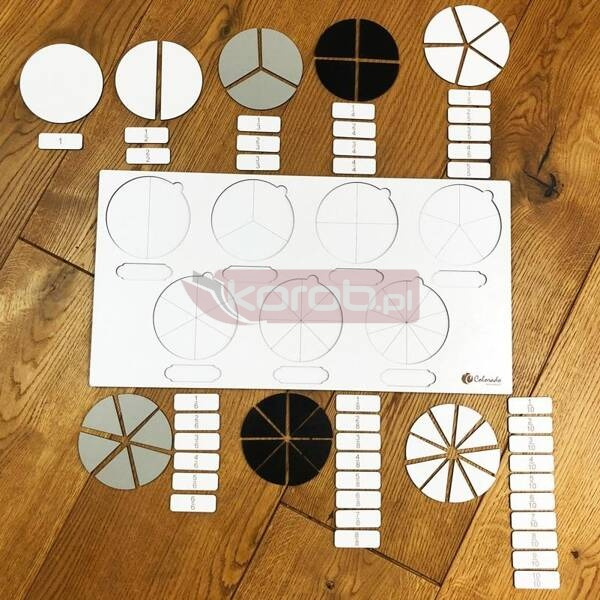 Przedstawiamy zestaw do nauki ułamków tablicę ułamkową. Komplet zawiera aż 79 elementów tablicę z wyciętymi kołami podzielonymi na dwie, trzy, cztery, pięć, sześć, osiem i dziesięć części, 39 części kół oraz 39 tabliczek z ułamkami. Wymiary tablicy to 27,5cm x 53cm, a średnica kół wynosi 10,7cm.