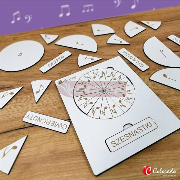 Zestaw składa się z tabliczki drewnianej z wygrawerowanymi laserowo wartościami rytmicznymi nut oraz ich nazwami.