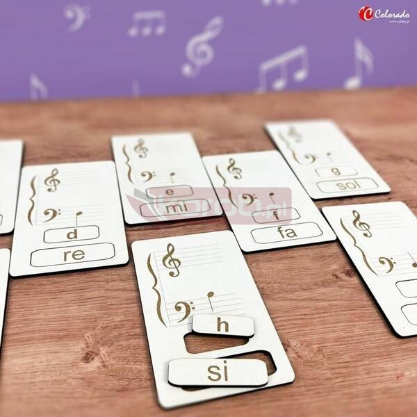Zestaw składa się z 8 drewnianych płytek wielkości 8,5 cm na 14 cm z wygrawerowaną nutą w kluczu basowym.