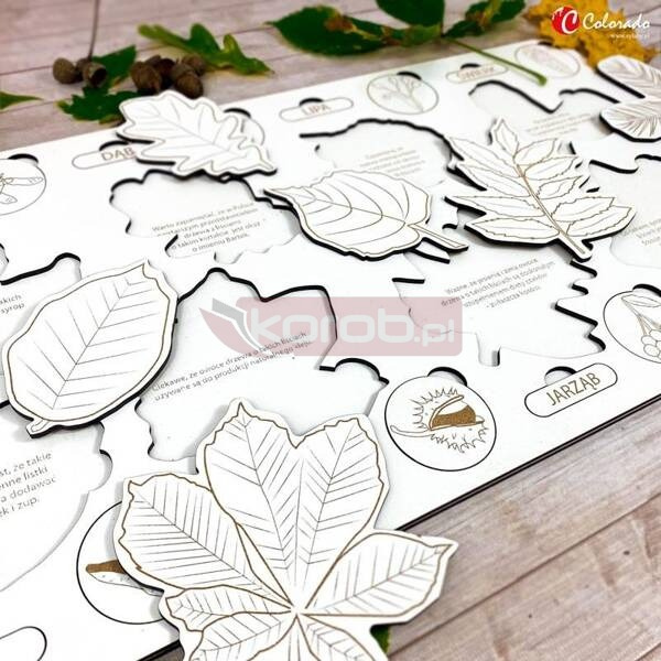 - 8 puzzli liści z wygrawerowanym ich wyglądem,