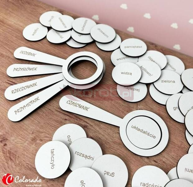 Zestaw zawiera 54 słowa + 5 lup z nazwami części mowy.