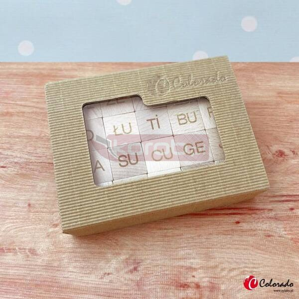 Na 19 klockach wygrawerowane są laserowo wielkimi literami 114 sylab otwartych, a jeden klocek zawiera 6 samogłosek (A, E, I, O, U, Y). Całość zapakowana jest w eleganckie pudełko, które ułatwia przechowywanie i zabieranie klocków ze sobą.