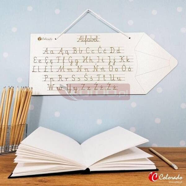 Prezentujemy drewniany alfabet do nauki pisania. Alfabet składa się tablicy na której wygrawerowane są wszystkie litery alfabetu (duże i małe).