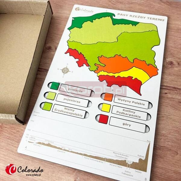 Tablica drewniana do nauki sześciu charakterystycznych pasów rzeźby terenu w Polsce: