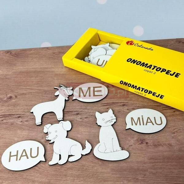 Widok na elementach: wyrażenia ME, UHU, KUM, KIC, TU TU, HAU, MIAU grawerowane laserowo