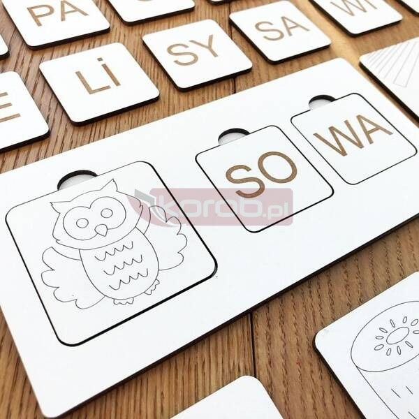 Ilość elementów: 26 elementów: 11 płytek z obrazkami (OKO, PASY, KOSA, OSA, KAWA, TEKA, SOFA, LISY, KIWI, SOWA, KOTY), 14 płytek z sylabami (z paradygmatami P, M, L, B, F, W, T, D, S, K) oraz podstawą bazową