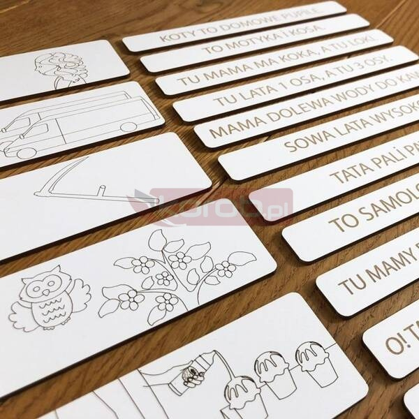 Ilość elementów: 25 z czego 12 płytek z obrazkami oraz 12 płytek ze zdaniami (utworzonymi z sylab prymarnych otwartych z wykorzystaniem paradygmatów P, M, L, B, F, W, T, D, S, K) oraz podstawą bazową,