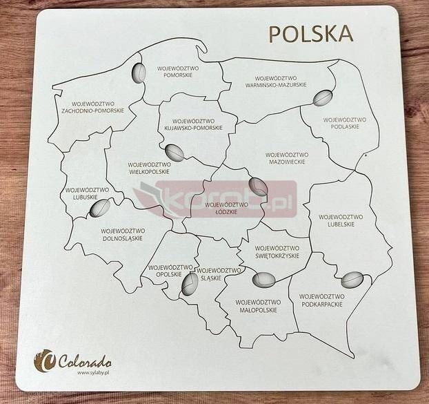 16 puzzli w kształcie województw z wygrawerowanymi ich nazwami.