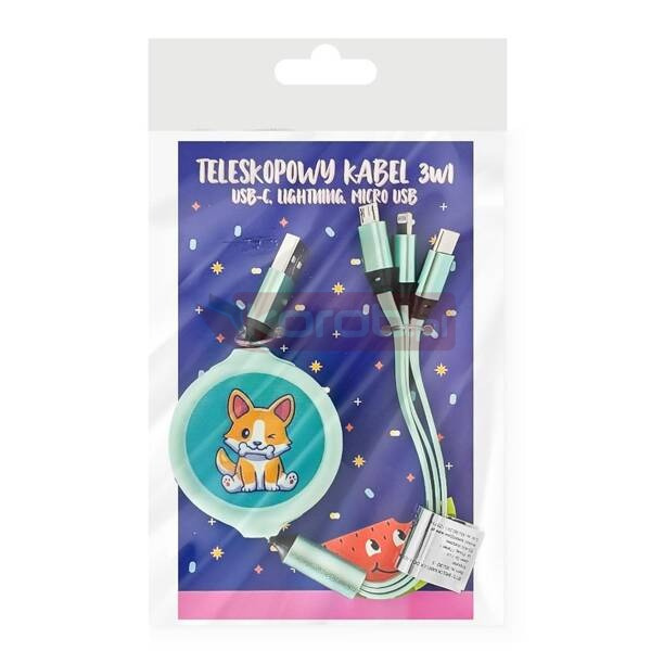 Produkt posiada 3 różne końcówki do ładowania oraz ponad metrowy, rozsuwany kabel co sprawia, że jest niezwykle użyteczny i uniwersalny. Kabelki do ładowania posiadają ciekawe kolory oraz grafikę. Długość kabelków po rozciągnięciu: 110 cm. Ładowanie: Micro/Lightning/Type C