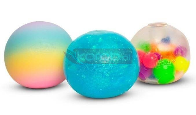 Gąbczaste kulki z motywem tęczy delfinów, o różnych teksturowanych wzorach i wykończeniach.