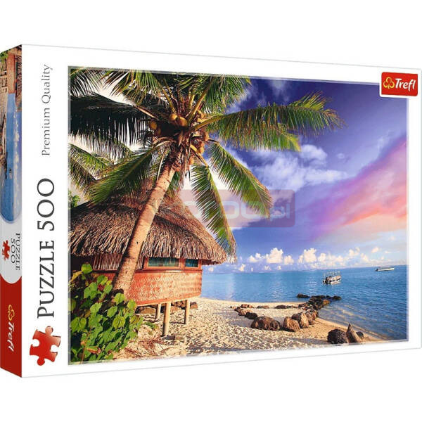 Puzzle Wyspa Bora-Bora składają się z 500 elementów i przedtawiają wakacyjny widok uchwycony na francuskiej wyspie leżącej na Oceanie Spokojnym. Gotowa układanka ma wymiary 48 x 34 cm.