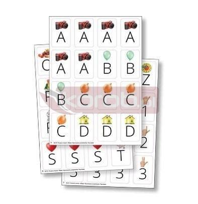 Zestaw kartoników z literami i obrazkami, których nazwy rozpoczynają się daną głoską, a także z liczbami przedstawionymi za pomocą palców dłoni i cyfr.