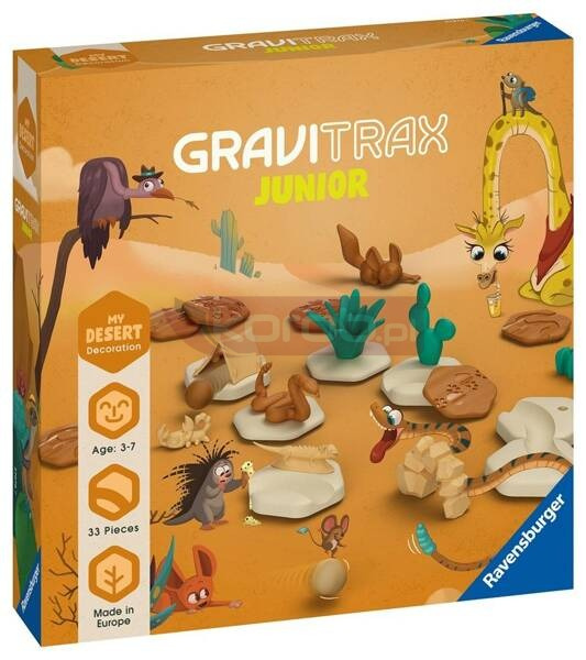 Zestaw uzupełniający GraviTrax Junior Pustynia zawiera 33 elementy, którymi możesz wzbogacić zestaw startowy GraviTrax Junior i poczuć się jak na prawdziwej pustyni. Wśród nich płytka podstawy, dodatkowe elementy toru i dekoracje.