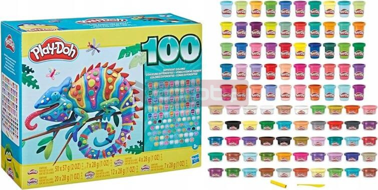 Duża paka 100 tub Play-Doh to nieskończone źródło kreatywnej zabawy! Małe rączki mogą skręcać, toczyć i formować kolorową ciastolinę w najbardziej niesamowite kształty, a potem rozgnieść je i zacząć wszystko od nowa! Ten fantastyczny zestaw jest idealny do wspólnych zabaw w domu i na przyjęciach, jest przepustką do świata ogromnej kreatywności! WOW! 100 tub w 100 kolorach! Ten zestaw Play-Doh zawiera ponad 4 kilogramy modeliny i jest idealny do zabawy dla dzieci w wieku od 3 lat. Ta kolekcja kolorów obejmuje 57 pudełek klasycznej masy do modelowania Play-Doh, 36 pudełek brokatu Play-Doh o super połysku i metalicznym połysku dla dodatkowego blasku i blasku oraz 7 kolorów konfetti Play-Doh, dzięki którym każda kreacja będzie imprezą! Ten zestaw doskonale nadaje się do dzielenia się, wykonywania prac rękodzielniczych i rozdawania prezentów na przyjęciach, do napełniania pinaty lub torby z gadżetami i nie tylko.