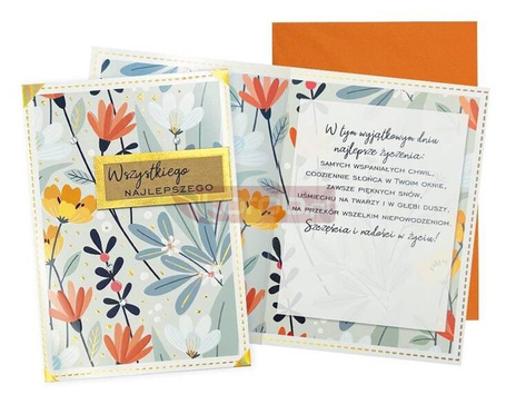 Kartka B6 z ozdobnej serii Dream Cards - nieduża, ale robi wrażenie dzięki atrakcyjnej kolorystyce i ciekawym zdobieniom. To idealny wybór łączący przyjazną cenę z jakością. Cechy szczególne: wielkość: B6, 16.6 x 11.7 cm po złożeniu, koperta: w zestawie, kolorowa, zdobienia: kolorowe, różnorodne, bogate (w zależności od wzoru: przyklejane dekoracje, elementy biżuteryjne, odstawniki, brokat metaliczne folie, tłoczenia itp.).