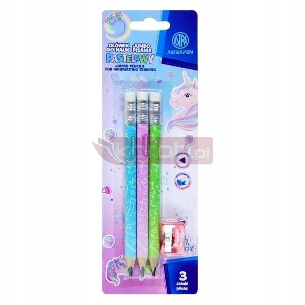 ASTRA OŁÓWEK TRÓJKĄTNY DO NAUKI PISANIA 3 szt + temperówka JEDNOROŻEC 4937