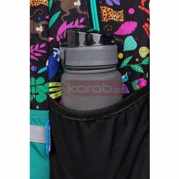 plecak posiada dwie boczne kieszenie, wykończone elastyczną gumką, co umożliwia w nich przenoszenie np. bidonu z napojem