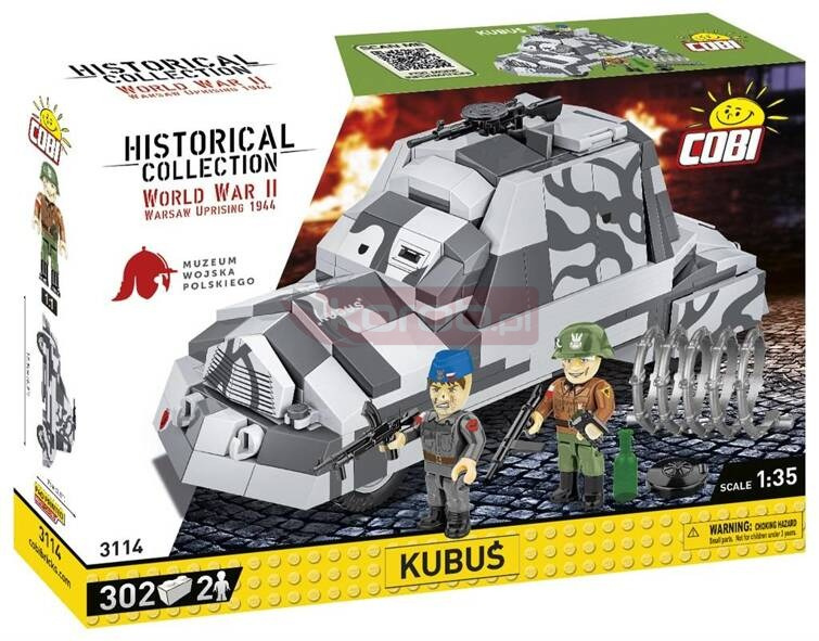 Cobi-3114 KUBUŚ HISTORICAL COLLECTION WORLD WAR II 302 klocków 2 figurkI Grupa wiekowa 7+ Skala 1:35 Kubuś to polski improwizowany samochód pancerny, który został zbudowany przez powstańców warszawskich w sierpniu 1944 roku podczas Powstania Warszawskiego. Pojazd ten powstał w zaledwie kilka dni, w warsztacie przy ul. Tamka. Do jego budowy wykorzystano podwozie ciężarówki Chevrolet 157 oraz blachy stalowe, które miały chronić załogę przed ogniem nieprzyjaciela. Kubuś, uzbrojony w karabiny maszynowe, brał udział w kilku akcjach bojowych, w tym w nieudanym ataku na Uniwersytet Warszawski. Po zakończeniu powstania Kubuś cudem przetrwał wojnę i obecnie jest eksponowany w Muzeum Wojska Polskiego w Warszawie jako symbol odwagi i pomysłowości powstańców warszawskich! Razem z Muzeum Wojska Polskiego postanowiliśmy uczcić 80. rocznicę wybuchu Powstania Warszawskiego! Przygotowaliśmy wyjątkowy klockowy zestaw z legendarnym samochodem powstańczym "Kubuś"! Klockowy model w skali 1:35 zawiera nadruki oraz wszystkie najważniejsze cechy swojego pierwowzoru znajdującego się w Muzeum Wojska Polskiego w Warszawie. Nie zapomnieliśmy nawet o tak mało znanym detalu, jak emblemat Kolumny Motorowej Wydra, który znajdował się na zderzaku! Nasz model został wyposażony w karabin maszynowy DP-28. Górny właz można otworzyć, aby umieścić w nim figurkę. Nie każdy wie, że do Kubusia wsiadało się przez otwór w podłodze! Zaznaczyliśmy w modelu to nietypowe wejście! Do zestawu dołączone są dwie figurki przedstawiające powstańców warszawskich. W szarym kombinezonie, z biało-czerwoną opaską na prawym ramieniu, z naszywką "Wydry" na lewym i niebieskiej furażerce przedstawiliśmy żołnierza z Kolumny Motorowej Wydra, która była częścią Zgrupowania Krybar. Drugi z żołnierzy należy do plutonu "Rafałki". To, co ich wyróżniało spośród innych formacji to używanie jako emblematów niemieckich saperskich żółtych trójkątnych proporczyków z trupią czaszką, które stanowiły oznaczenie dla terenu zaminowanego bądź skażonego chemicznie. Symbol ten znajduje się na lewym ramieniu żołnierza. Na hełmie z boku białą farbą namalowana jest litera "R" charakterystyczna dla tej formacji. Obie figurki zostały wyposażone w akcesoria takie jak: pistolet maszynowy STEN, ręczny karabin maszynowy Bren, granat ręczny i minę. W zestawie znajduje się również butelka oraz fragment drutu kolczastego. Powstanie warszawskie wybuchło 1 sierpnia 1944 roku i trwało aż do 3 października. Było zbrojnym wystąpieniem polskiego ruchu oporu, głównie Armii Krajowej, przeciwko okupującym Warszawę wojskom niemieckim. Celem powstania było wyzwolenie stolicy przed nadejściem Armii Czerwonej, aby zapewnić suwerenność Polski po wojnie. Mimo początkowych sukcesów, powstańcy nie zdołali utrzymać swoich pozycji w obliczu przeważających sił niemieckich i braku dostatecznej pomocy z zewnątrz. Po 63 dniach zaciętych walk powstanie zostało stłumione. Zginęło około 16 tysięcy powstańców i około 150-200 tysięcy cywilów, a miasto zostało niemal doszczętnie zniszczone. Powstanie warszawskie pozostaje symbolem polskiego heroizmu i patriotyzmu. 302 wysokiej jakości elementy wyprodukowane w UE przez firmę z ponad 20-letnią tradycją, spełniają normy bezpieczeństwa dotyczące produktów dla dzieci, w pełni kompatybilne z innymi markami klocków konstrukcyjnych, klocki z nadrukami nie odkształcają się i nie bledną w czasie zabawy czy pod wpływem temperatury, model czołgu, dwie figurki, akcesoria, Wymiary modelu (dł x wys): 17,5 cm (6.9") x 9 cm (3.5")