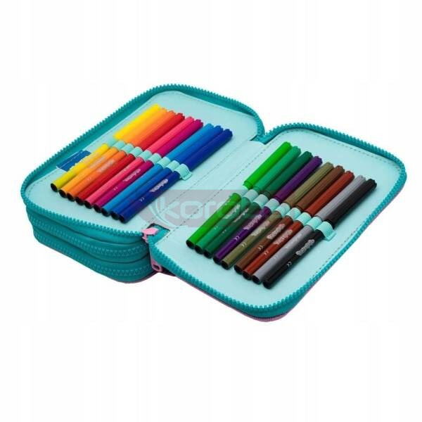W jednej komorze piórnika CoolPack mieszczą się flamastry, w drugiej kredki ołówkowe, zaś w trzeciej niezbędne przybory szkolne.