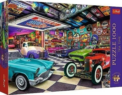 Puzzle Garaż kolekcjonera samochodów przedstawiają imponującą kolekcję aut z minionej epoki. Po ich ułożeniu powstanie obraz o wymiarach 683x480 mm.