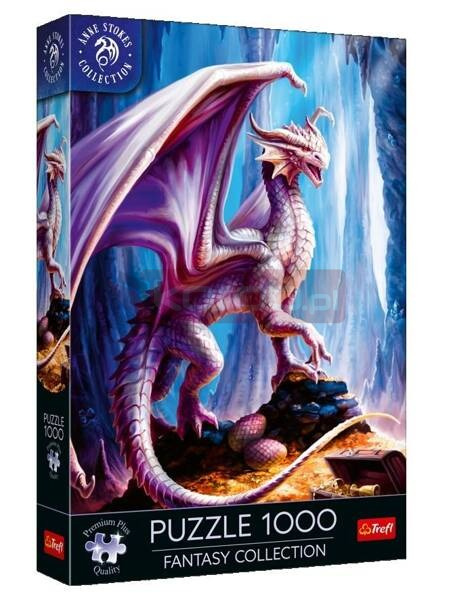 Puzzle Strażnik Skarbu, przedstawiają zachwycającego, fioletowego smoka, strzegącego kosztowności. Po ich ułożeniu powstanie obraz o wymiarach 683x480 mm.