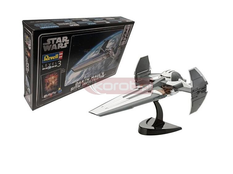 Zestaw upominkowy z akcesoriami ( 6 podstawowych farbek, pędzelek, klej). Infiltrator Sithów, znany również jako Scimitar, to zmodyfikowany statek Star Courier, który został specjalnie przerobiony do użytku przez Lorda Sithów Dartha Maula. Znany z zaawansowanego urządzenia maskującego, okręt może wkroczyć na terytorium wroga niezauważony. Potężny napęd jonowy umożliwia osiąganie dużych prędkości zarówno w przestrzeni kosmicznej, jak i w atmosferach planetarnych. Statek ten odegrał kluczową rolę w filmie Gwiezdne wojny: część I: Mroczne widmo, gdzie pomagał Darthowi Maulowi dyskretnie i skutecznie wykonywać jego misje. Dzięki temu zestawowi modelarskiemu możesz samodzielnie odtworzyć i przeżyć kawałek tej fascynującej historii. Zawartość zestawu: Model plastikowy do sklejania (niezmontowany) Ilustrowane, wielojęzyczne instrukcje budowania Naklejki Kolory podstawowe (Revell Aqua Color) Klej (Revell Contacta Professional Mini) pędzel plakat Specyfikacja Numer katalogowy:REV-05638 Producent: Revell Wymiary: 386x248x67 Długość: 221 mm Skala: 1:120 Stopien trudności: 3 Ilość elementów: 35 Instrukcja: tak Grupa wiekowa: 10+