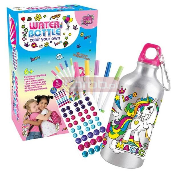 Zestaw zawiera butelkę na wodę, 5 pisaków oraz 45 diamencik. Wystarczy oderwać diamencik i przykleić do butelki, a wzór pokolorować wedle własnego upodobania. Dzięki temu dzieci mają szansę na tworzenie różnorodnych kompozycji i zrobienie własnego, oryginalnego bidonu.