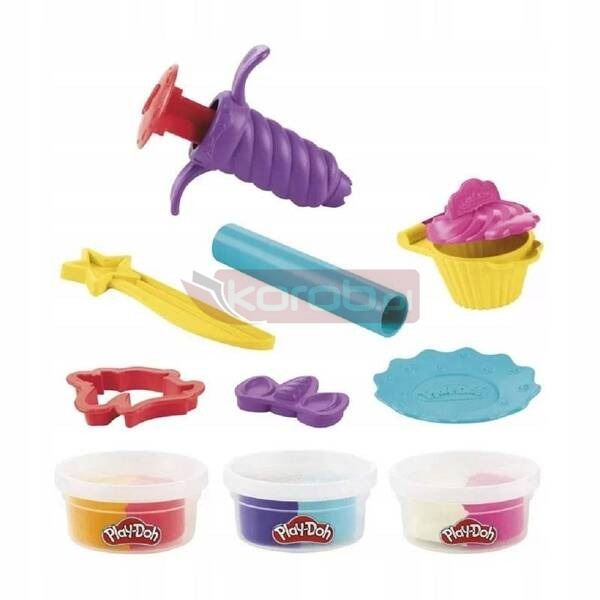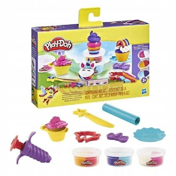 Dzięki temu niesamowitemu zestawowi Play-Doh dzieci będą się dobrze bawić, robiąc desery, babeczki i nie tylko. Dzieci będą się dobrze bawić, wykorzystując akcesoria o tematyce fantasy w swoich kolorowych kreacjach. Zestaw zawiera 3 opakowania masy dwukolorowej. Każde opakowanie zawiera dwa różne kolory brokatu, które dodają dodatkowej magii.