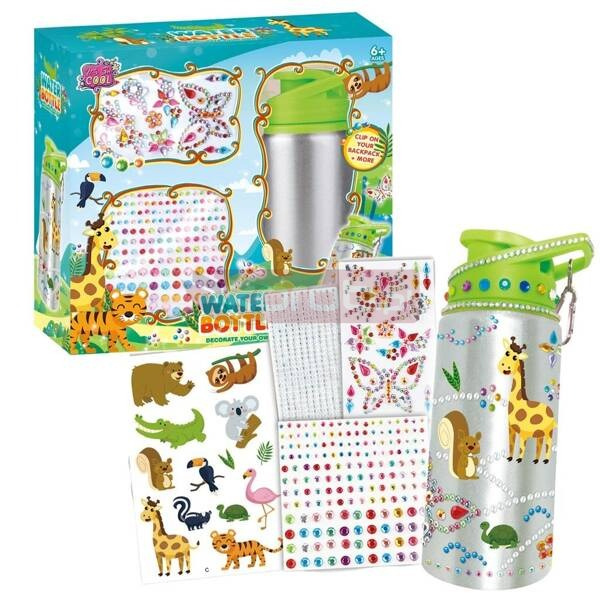 Zestaw zawiera butelkę na wodę, naklejki oraz różnokolorowe diamenciki. Dzieci mogą wybierać spośród różnych wzorów i układów, tworząc własne, unikalne dzieła sztuki.
