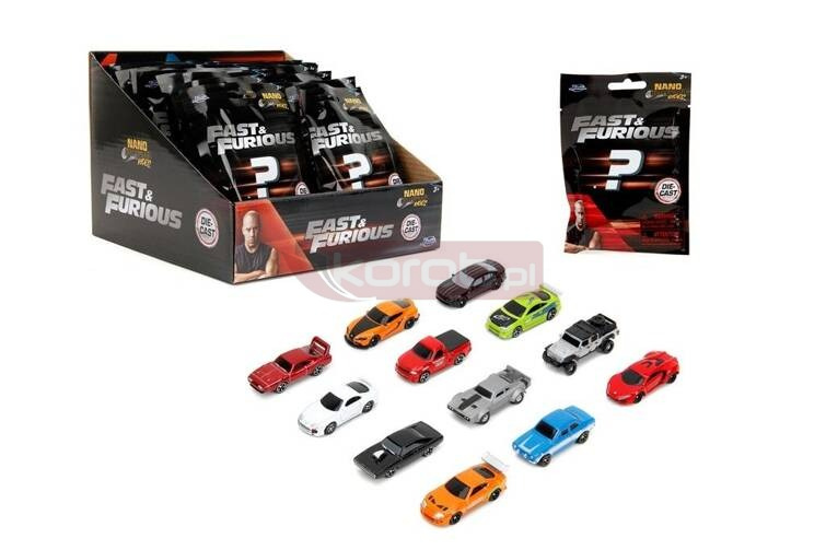 Metalowe nano pojazdy na licencji Fast&Furious zapakowane w zadrukowanej saszetce. Każda saszetka zawiera jeden pojazd. W kolekcji 12 modeli aut o długości 4 cm. Display 24 sztuki, 8l+