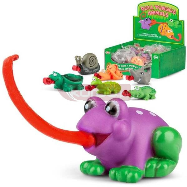 Zwierzęta ze zwijanym językiem tym razem w bardzo kolorowej i wyposażonej w naprawdę bardzo długie języki, wersji. Żaba, jaszczurka, ślimak... wybór jest szeroki i zachęca do stworzenia całej kolekcji. Jak działa zabawka? Wystarczy ścisnąć gumowe zwierzątko, a natychmiast wystrzeli swój język na całą długość.