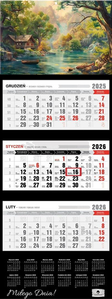 Kalendarz Trójdzielny PREMIUM Z WYPUKŁĄ GŁÓWKĄ. Format 315/810mm. Trzy komplety klasycznych kalendariów z przesuwnym okienkiem. Główka z otworem wierconym. Dodatkowo nazwy miesiąca i dni tygodnia w języku Ukraińskim, Angielskim i Niemieckim. Kalendarium dodatkowo zawiera fazy księżyca i znaki zodiaku. Dużo miejsca do notowania, czytelne duże litery i cyfry. DODATKOWO PRZEDŁUŻONE PLECKI KOLOREM DOPASOWANE DO WZORU ZE SKRÓCONYM KALENDARIUM NA ROK 2026.