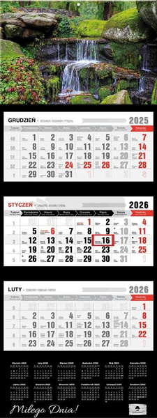 Kalendarz Trójdzielny PREMIUM Z WYPUKŁĄ GŁÓWKĄ. Format 315/810mm. Trzy komplety klasycznych kalendariów z przesuwnym okienkiem. Główka z otworem wierconym. Dodatkowo nazwy miesiąca i dni tygodnia w języku Ukraińskim, Angielskim i Niemieckim. Kalendarium dodatkowo zawiera fazy księżyca i znaki zodiaku. Dużo miejsca do notowania, czytelne duże litery i cyfry. DODATKOWO PRZEDŁUŻONE PLECKI KOLOREM DOPASOWANE DO WZORU ZE SKRÓCONYM KALENDARIUM NA ROK 2025.