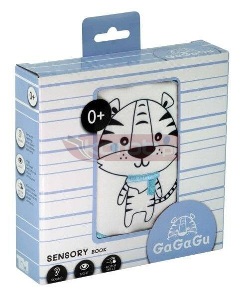 Książeczka sensoryczna GaGaGu posiada kontrastujące kolory i wzory, co stymuluje wzrok dziecka. Książka jest dwustronna. Z jednej strony kontrastowe ilustracje zwierzątek z haftowanymi elementami, które są odczuwalnie odmienną dla dziecka fakturą pod palcami stymulacja dotykowa, nauka przez dziecko różnych faktur. Z drugiej strony znajdują się okrągłe pluszowe klapki, które pozwalają dziecku pobawić się w jedną z jego ulubionych gier i zrobić kupę! - każda klapka zadrukowana jest obustronnie innym wzorem - jeden element, a dwa zupełnie różne wrażenia wizualne. Pod pluszowymi klapkami z wizerunkami zwierząt znajdują się symbole pokarmu, który zjada zwierzę + pluszowe klapki mają wszyty materiał szeleszczący i szeleszczący przy otwieraniu i dotykaniu - mniejsze dziecko uczy się różnych kształtów i kolorów oraz otrzymuje stymulację słuchową, starsze dziecko uczy się, jakim pokarmem je dane zwierzę