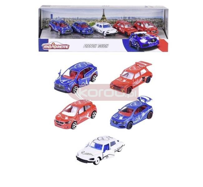 Metalowe samochody ze specjalnej edycji limitowanej French Touch na 60-lecie Majorette. French Touch to linia dedykowana Francji - kraju pochodzenia marki, jej największym zabytkom oraz charakterystycznym produktom. Pojazdy mają otwierane elementy, gumowe opony, pracujące zawieszenie. W zestawie 5 pojazdów, w tym dwa ekskluzywne: Renault Turbo i Renault Megane. Skala 1:64, długość: 7,5 cm, 3l+