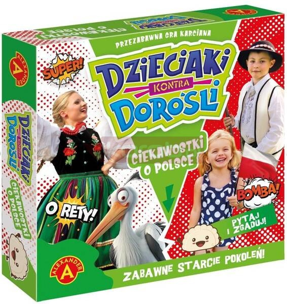 "Dzieciaki Kontra Dorośli - Ciekawostki o Polsce" to gra planszowa, która zapewni świetną zabawę całej rodzinie. Dzieci rywalizują z dorosłymi, odpowiadając na ciekawe pytania dotyczące naszej ojczyzny. Dzięki dwóm oddzielnym zestawom kart z pytaniami o innym poziomie trudności dedykowanym dzieciom oraz rodzicom, szanse na wygraną są takie same dla obu drużyn.