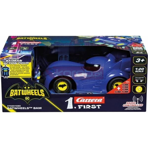 Zdalnie sterowany Batmobil. Pojazd DC Batwheels z figurką Batmana. Niebieski bolid Carrera 1. First RC.