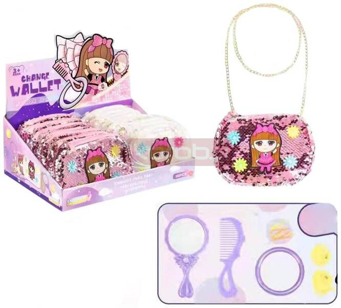 Zestaw piękności zapakowany w elegancką torebkę z cekinami.
