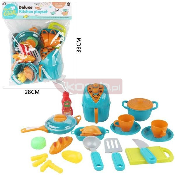Zestaw naczyń oraz produktów kuchennych.