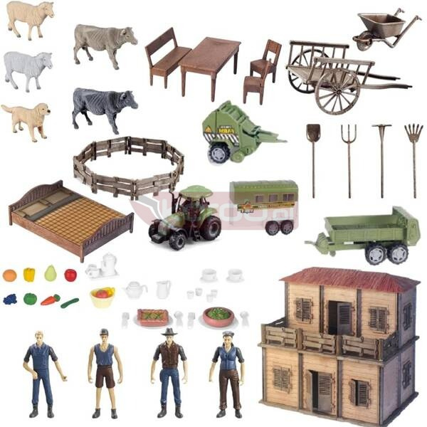 Zestaw ten składa się z wielu elementów, które pozwalają dziecku stworzyć swoją wymarzoną farmę. Domek, narzędzia rolnicze, stół, krzesła, ławka, łóżko, zwierzątka, owoce, naczynia i wiele innych detali tworzy realistyczne środowisko wiejskie. Dzieci uwielbiają interakcję, a w tym zestawie znajdują się zarówno sympatyczni rolnicy, jak i urocze zwierzątka wiejskie, takie jak krówki, owieczki i piesek. To doskonała okazja do rozwijania empatii i opiekuńczych umiejętności. Nie może zabraknąć tradycyjnego rolniczego traktora z przyczepką w tym zestawie. Dziecko może jeździć nimi po farmie, przewozić owoce czy inne przedmioty i bawić się jak prawdziwy rolnik.