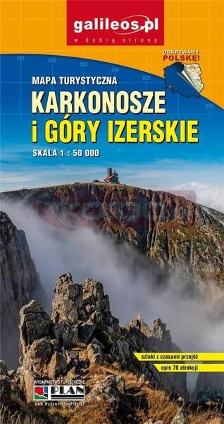 Mapa Karkonoszy i Gór Izerskich na jednym arkuszu. Mapa była aktualizowana w terenie i posiada bardzo dobrą dla turysty skalę 1:50 000. Na mapie zawarto aktualny przebieg szlaków rowerowych i pieszych z zaznaczonymi najważniejszymi atrakcjami turystycznymi. Rewers mapy zawiera szeroki opis krajoznawczy wraz z fotografiami. Ukształtowanie terenu pokazano przy pomocy warstwic o cięciu co 20 m. Mapa posiada siatkę geograficzną opartą na elipsoidzie WGS 84, stosowaną w nawigacji.