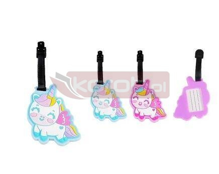 Zawieszka do walizek, plecaków lub innego bagażu z miejscem na wpisanie danych kontaktowych. Wykonana z elastycznego silikonu z tłoczeniem. Z regulowanym paskiem i przezroczystym plastikowym okienkiem z tyłu, które pozwala zobaczyć wpisane dane. Wymiary: 75 x 80mm. Projekt jednorożec w dwóch różnych kolorach różowym i błękitnym.
