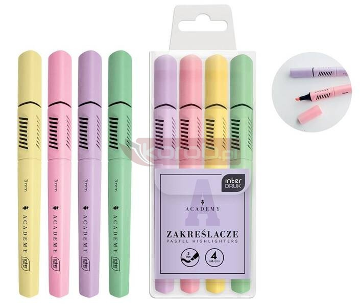 Zestaw 4 zakreślaczy w praktycznym etui w pastelowych kolorach: żółtym, fioletowym, różowym i zielonym. Trójkątny profil. Matowe wykończenie. Ścięta końcówka o szerokości do 3 mm.