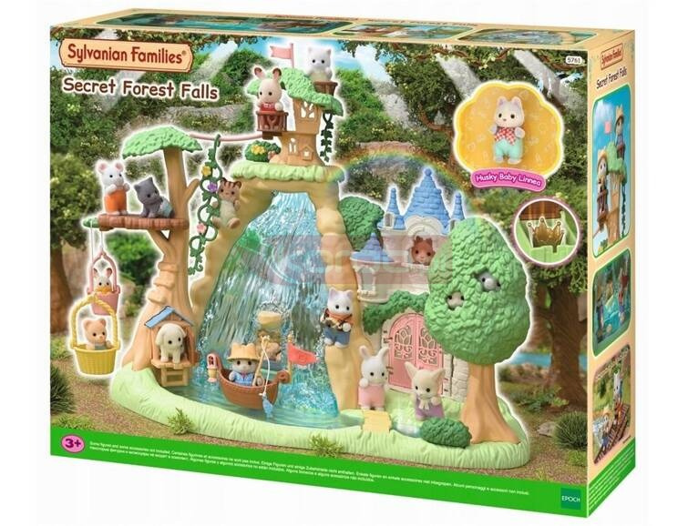 Duży, piękny zestaw z wyspą pełną tajemnic z wodospadem. Wyspa Secret Forest ma mnóstwo ciekawych funkcji i jest pełna niezliczonych atrakcji, zaczynając od wielkiego wodospadu, z którego można spłynąć tratwą, zamek z ukrytym skarbem, domek na drzewie, łódź i wiele więcej! Kto jest chętny na wyprawę w poszukiwaniu skarbu w Tajemniczym Lesie? Zestaw zawiera figurkę dziecka z rodziny piesków Husky w stroju poszukiwacza przygód, kamizelkę ratunkową, latarnię, flagę, wędkę, kapelusz odkrywcy i wiele innych przedmiotów, które przydadzą się podczas wyprawy! Poszukajmy kluczy do skrzyni skarbów! Jest wiele miejsc do przeszukania, wyciąg kubełkowy, kolejka linowa z bluszczu, domek na drzewie, wielki wodospad z jaskinią ukrytą za spadającą wodą, sekretna ścieżka, most zwodzony i inne kryjówki! Obróć podłogę zamku, wtedy pojawi się skrzynia ze skarbami! Otwórz ją kluczem i wyjmij znajdujący się w środku skarb! Zabawki Sylvanian Familes są produkowane przez japońską firmę Epoch od ponad 35 lat. Wyróżnia je wyjątkowa jakość oraz dbałość o szczegóły. Figurki zwierzątek Sylvanian Families pokryte są delikatnym, jedwabistym futerkiem i mają ruchome główki, rączki oraz nóżki.