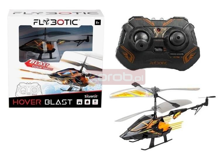 Wystrzałowy helikopter do zadań specjalnych przeniesie zabawę w zdalne sterowanie na kolejny poziom! Pojazd potrafi nie tylko latać, ale także strzelać rakietami do celu! Za sterowanie Hover Blastem odpowiada dołączony do zestawu pilot. Helikopter posiada 3 kanały sterowania, odpowiedzialne za poruszanie się na osiach: przód tył, lewo prawo oraz góra dół. W zestawie, poza pojazdem i pilotem, znajduje się 8 rakiet, tarcza do trenowania celności, 2 zapasowe śmigła i kabel USB do ładowania helikoptera. Z pojazdu należy korzystać wewnątrz pomieszczeń.