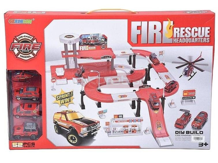 parking straży pożarnej, 52 części, 4 pojazdy metalowe; 52x35x7cm, W/B