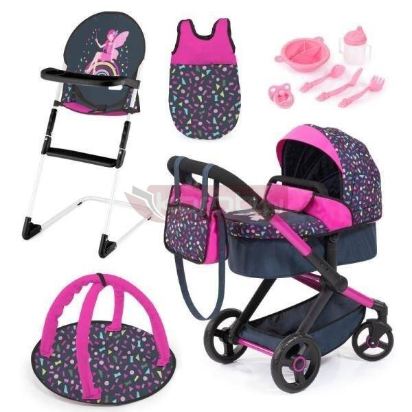 Ten duży zestaw dla lalek składa się z wózka dla lalek, wysokiego krzesełka, śpiworka, koc do zabawy i plastikowych akcesoriów. Nowoczesny wózek dla lalek combi XEO ma elegancki wygląd i wiele różnych funkcji, odpowiedni dla lalek o wielkości do 46 cm. Dzięki regulowanej rączce wózek ten można łatwo dostosować do wzrostu dziecka; możliwe jest również umieszczenie walizki w obu kierunkach. Ponadto XEO ma odwracalny uchwyt, dzięki czemu można go łatwo przesuwać w obie strony. Dzięki dołączonym zatrzaskom i możliwej zmianie kata przenośnego łóżeczka wózek dla lalek można w kilka sekund zamienić na wózek spacerowy. Obracane przednie kola gwarantują stabilne pokonywanie zakrętów. Zestaw zawiera również śpiworek do usypiania lalki.